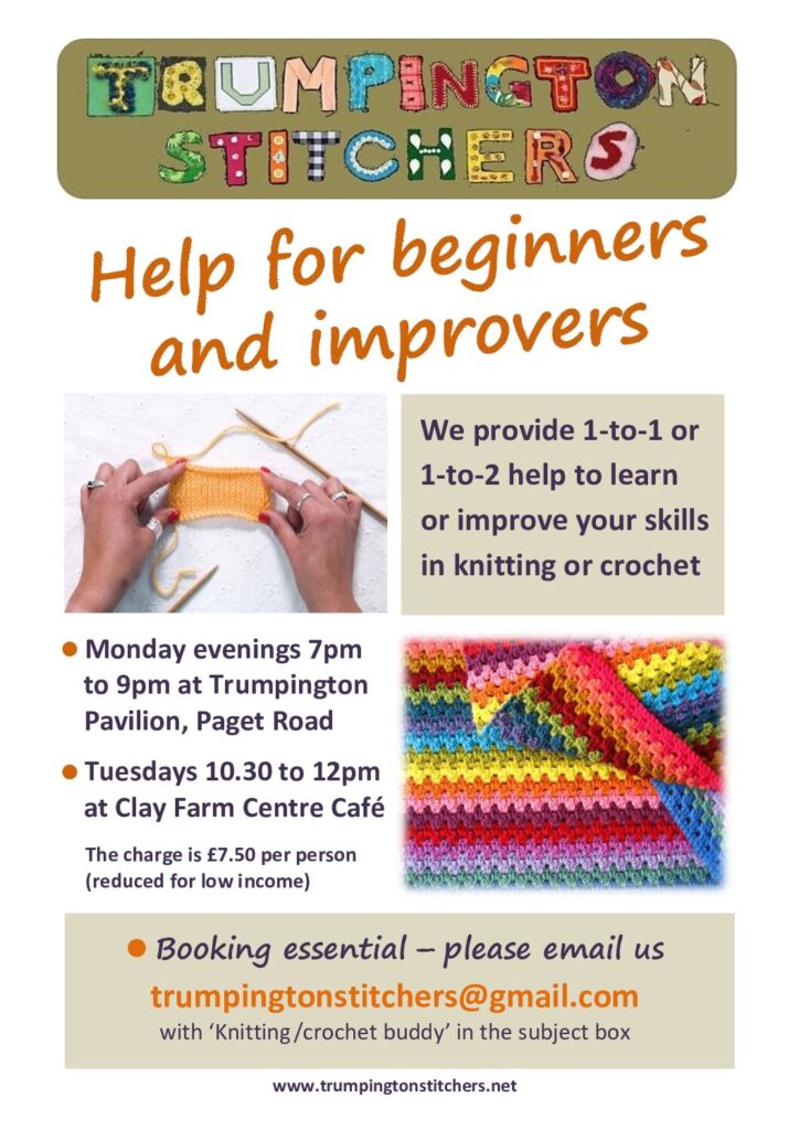 - Tuesdays from 10:30am to 12pm at Clay Farm Centre. This is our Stitching For Charity group, producing goods for local and national charities. No charge, but we do try to support the café by buying drinks or delicious lunches. Materials provided, mainly in the form of yarn and crochet and knitting equipment.